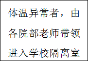 2.学生返校后每日监测体温和健康状况,发现学生体温检测异常。发现者第一时间把学生送学校设立的隔离区。并及时上报学校,安疫情防控流程进行救治。