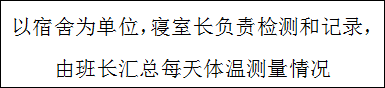 4.各院(部)密切监测学生的健康状态,由寝室长负责测量本宿舍学生的体温,每日早午各一次,并做好记录。