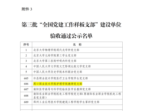 近日,教育部思想政治工作司公布了第三批“全国党建工作样板支部”建设单位验收通过名单,我校护理学院教师党支部顺利通过验收。