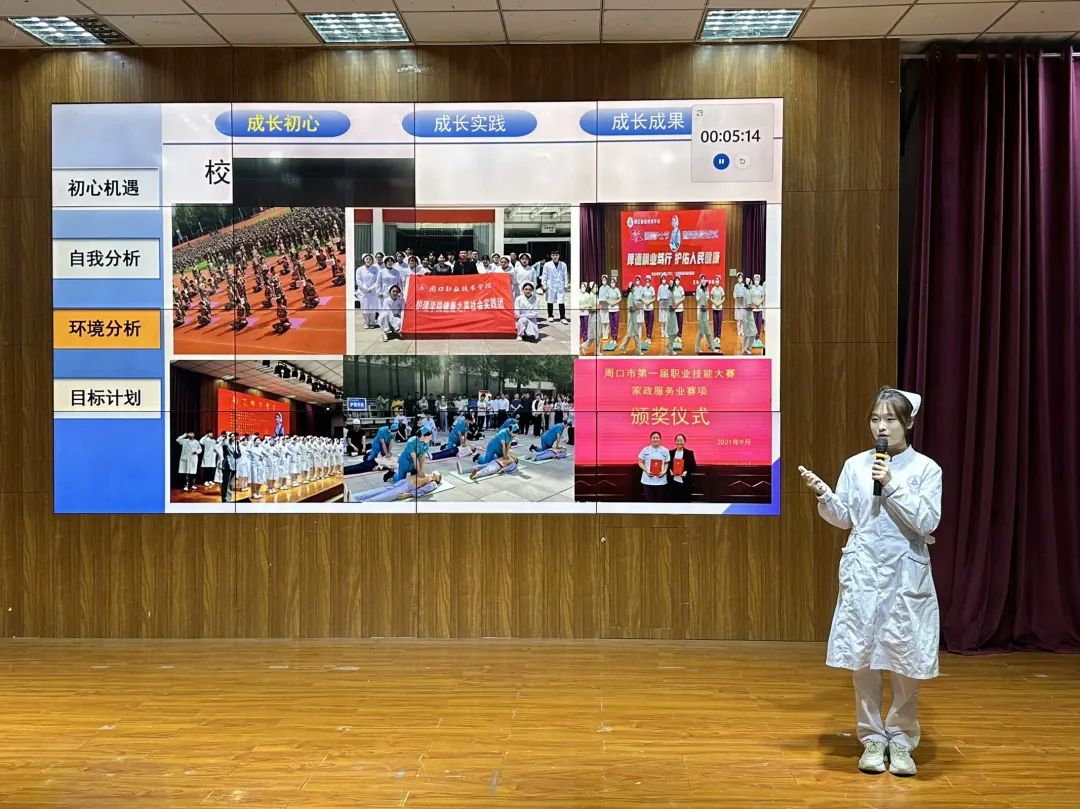 比赛现场,各位参赛选手立足当下,畅想未来,从自我认知、职业探索、目标确立、行动方案、行动成果等方面进行详细展示,向评委和观摩师生陈述自己完整的职业生涯规划。
