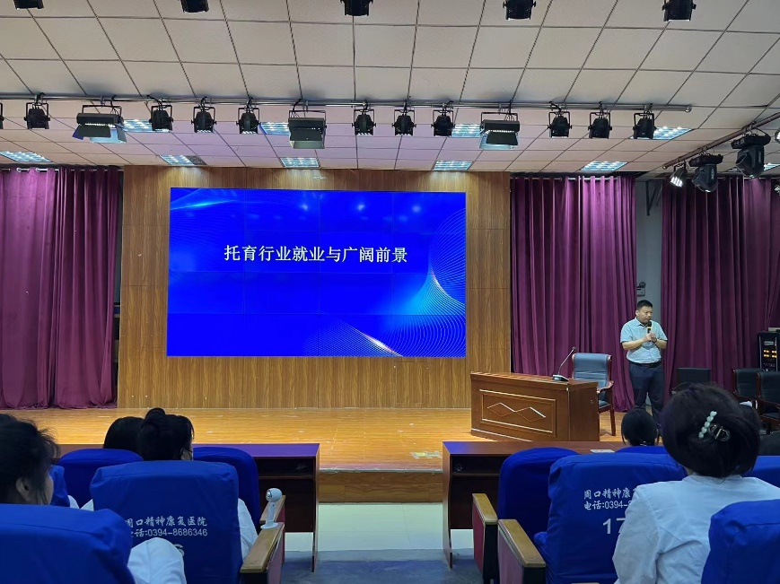 5月28日,周口职业技术学院护理学院在文昌校区一楼多媒体开展企业进校园企业招聘宣讲活动,周口职业技术学院护理学院领导班子成员和22级托育与服务管理专业全体学生参加。本次活动荣幸邀请到河南友森实业集团有限公司的负责人许占振先生,为同学们深入解析托育行业的就业机遇与发展前景。