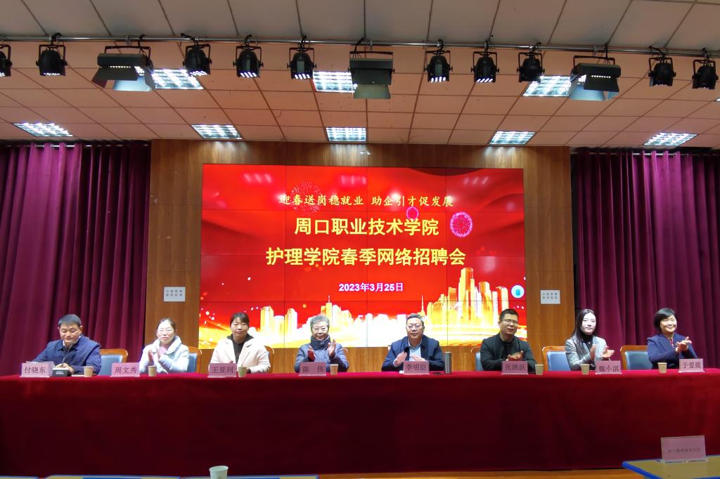本次招聘会特邀周口人合医院、周口东新区人民医院、鄢陵周氏医院、周口淮海医院、周口精神康复医院5家医院参加。副校长李明臣,护理学院党总支书记于爱霞、院长付晓东、2023级护理专业毕业生参加了此次会议。同时开通网络直播通道,数百名毕业生通过手机端观看了招聘会并与用人单位互动沟通。