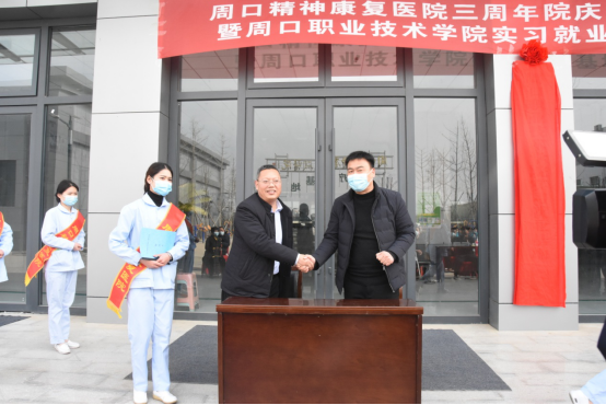 李明臣代表学校对周口精神康复医院建院三周年表示祝贺,并向医院对我校教学与就业工作的关心支持表示感谢,介绍了我校的办学历程、发展目标以及医学类专业发展状况、办学特色、改革成果等,并表示这次院校合作,是双方共同推进医学教育改革和医疗事业发展的重要举措,必将在校院合作、产教融合、医教协同、共同发展上取得显著成果,为绘就周口特色添彩画卷做出更大的贡献。