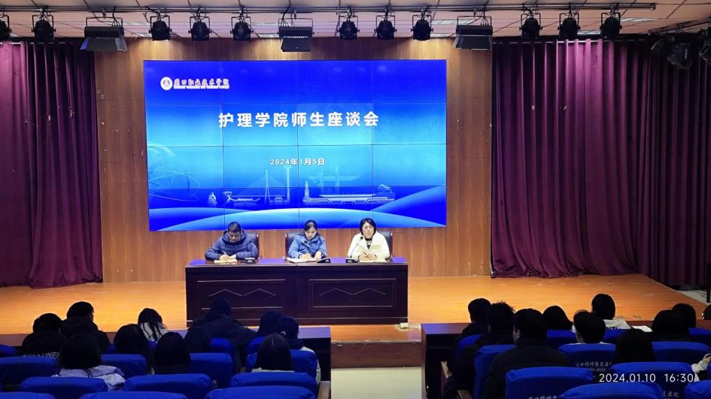 为进一步加强教学过程管理,深入了解教学开展实际情况,不断提高教学质量,扎实推进护理学院教学检查工作,1月5日下午,护理学院召开了2023-2024学年第一学期期末教学师生座谈会。本次会议由护理学院教办主任刘亚主持,护理学院党总支书记张华珍,院长付晓东、教师代表及各班学生代表参加。